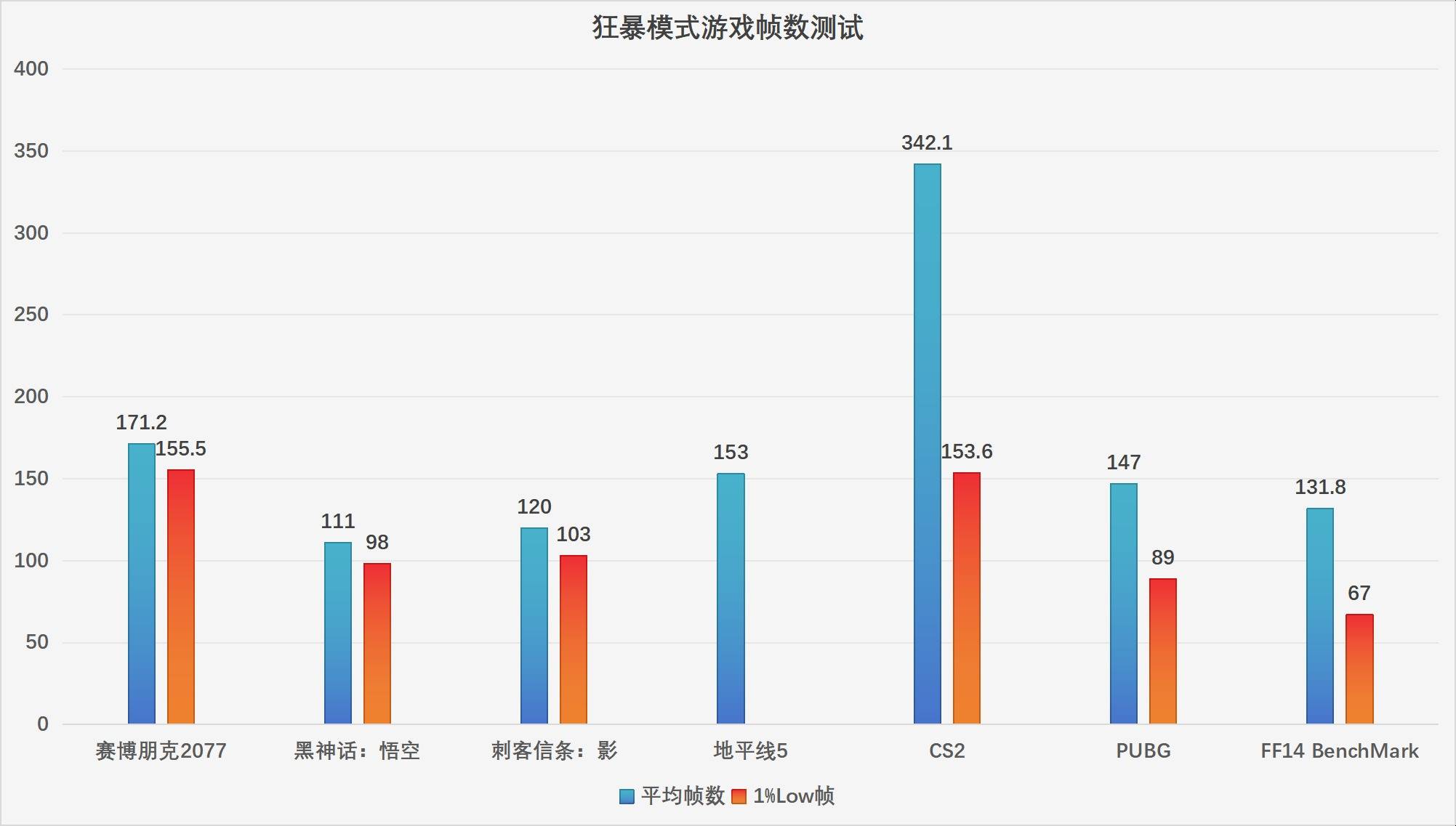 通过测试,在相同的画质下,游戏的帧数并没有大幅减少一半多,在大型3A游戏中,所有游戏均保持在了60fps以上的流畅度及格线以上,哪怕是2077或黑神话悟空的高画质,在DLSS与帧生成的帮助下也能保证不错的表现。网游方面虽然但看帧率的数字比狂暴模式降低了不少,但是如果是实际游玩倒也不会感受到什么卡顿,尤其在这块240Hz的屏幕下,视觉上的流畅度也没有下降多少。