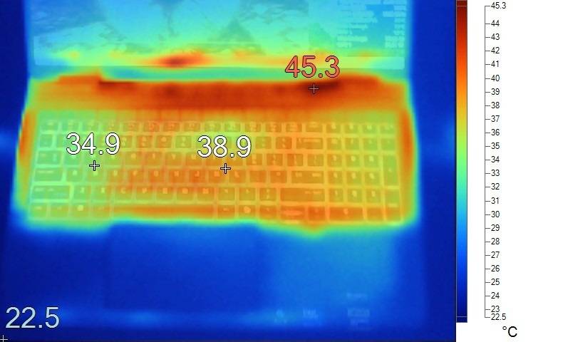 同样的环境下烤机30分钟后,分贝仪显示分贝噪音在47分贝~47.5分贝左右,C面的热点温度为45.3度,键盘左侧的主要操作区域,W键和S键中心位置温度不到35度。