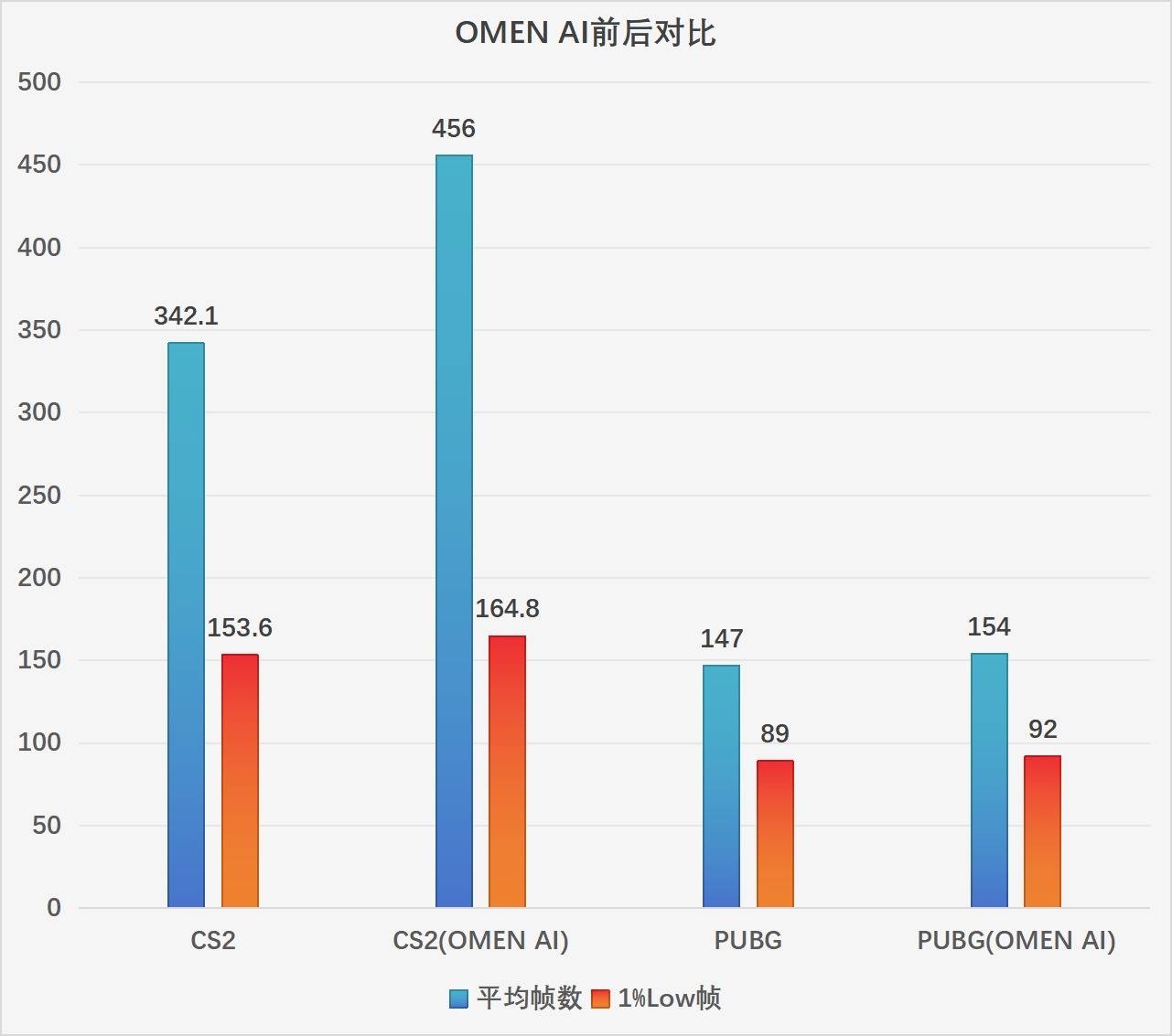 CS2与PUBG采用与上面测试时相同的画质设置,在OMEN Gaming Hub开启OMEN AI选项后根据不同游戏自动调节游戏画面设置,可以看到仅降低了一点点的画质,换来了更高的帧数表现。