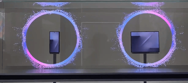 展会现场展示了两台设备:一台完全展开,另一台保持折叠状态。不过它们被放置在玻璃罩后方,观众无法亲手操作或体验。
