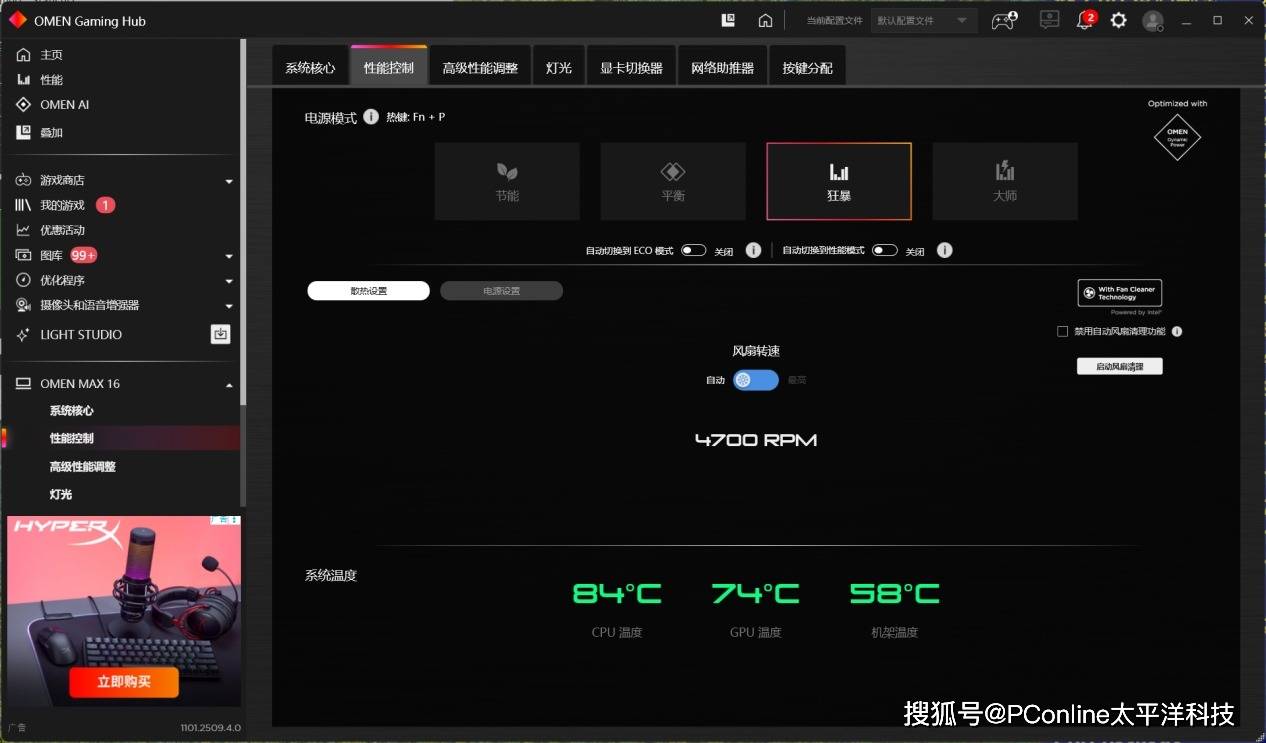 OMEN暗影精灵Max共提供了四种性能模式,分别为节能模式、均衡模式、狂暴模式与大师模式,其中节能模式可限制CPU/GPU性能以延长续航,而大师模式则是开放一些底层硬件参数供用户调节,是一种面向专业硬核用户使用的模式,对于普通用户、小白用户来讲,狂暴模式已经可以获取到核心全部性能表现了,平衡模式则是提供了性能、温度和噪音之间的权衡点,所以我们本次测试主要聚焦于狂暴模式与均衡模式,来看看OMEN暗影精灵在这两个模式下的性能调校与使用体验。