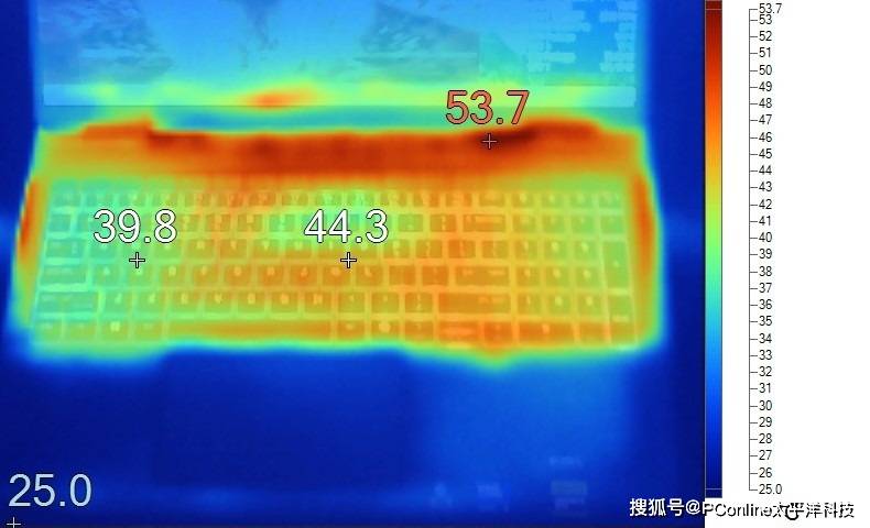 表面温度情况,C面的热点位于右侧出风口区域,温度为53.7度,键盘左侧的主要操作区域,W键和S键中心位置温度不到40度。暗影精灵MAX的C面应该是做了不错的隔热处理,满载时的表面温度并不会过于烫手从而影响使用。