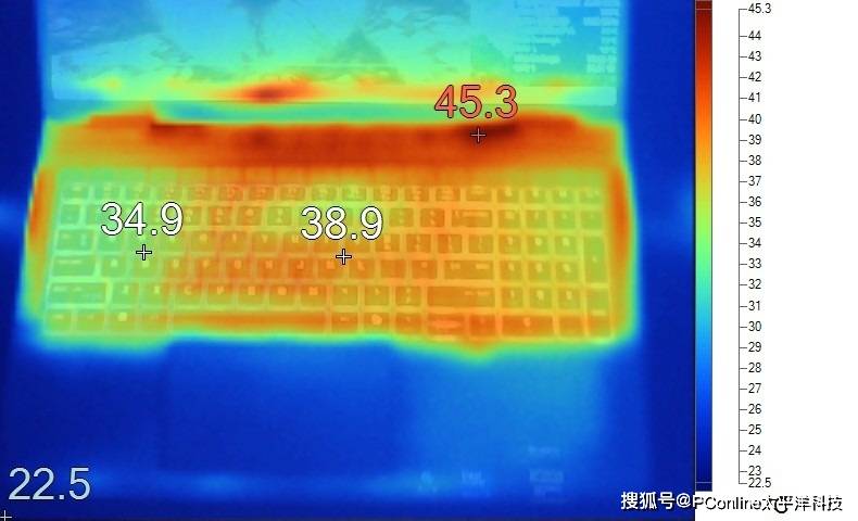 同样的环境下烤机30分钟后,分贝仪显示分贝噪音在47分贝~47.5分贝左右,C面的热点温度为45.3度,键盘左侧的主要操作区域,W键和S键中心位置温度不到35度。