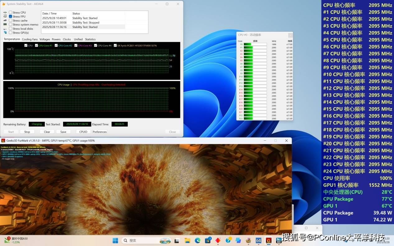 使用AIDA64 Stress FPU+Furmark 1920*1080 8xMSAA进行CPU和GPU的双烤满载测试,CPU功耗75W、温度100度、P核心频率3.1GHz~3.3GHz、E核心频率3.1GHz~3.2GHz;GPU功耗175W、温度85度、频率2400MHz左右;