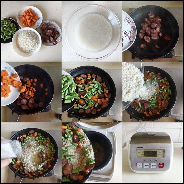 制作过程:1. 准备好原材料; 将腊肠、胡萝卜和四季豆都切好备用; 2. 大米洗净后浸泡20分钟备用; 3. 烧热锅放入少许油,将腊肠片放进锅中煸炒至微微出油; 4. 加入准备好的胡萝卜丁放进锅中煸炒,用油煸炒过的胡萝卜更利于消化吸收; 5. 将准备好四季豆放进锅中翻炒几下; 6. 将洗净大米放进锅中翻炒几下; 7. 加入少许盐调味; 8. 将炒过的食材放进电饭煲中; 9. 按下煮米饭的功能键即可;