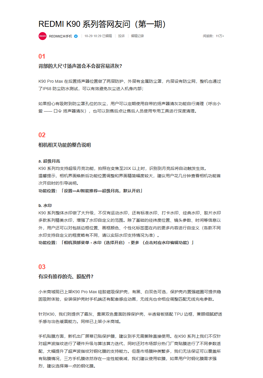 【太平洋科技快讯】10 月 30 日,针对网友对 REDMI K90 Pro Max 背部大尺寸扬声器是否易进灰的疑问,小米 REDMI 官微在近日的《K90 系列答网友问》活动中作出了解答。
