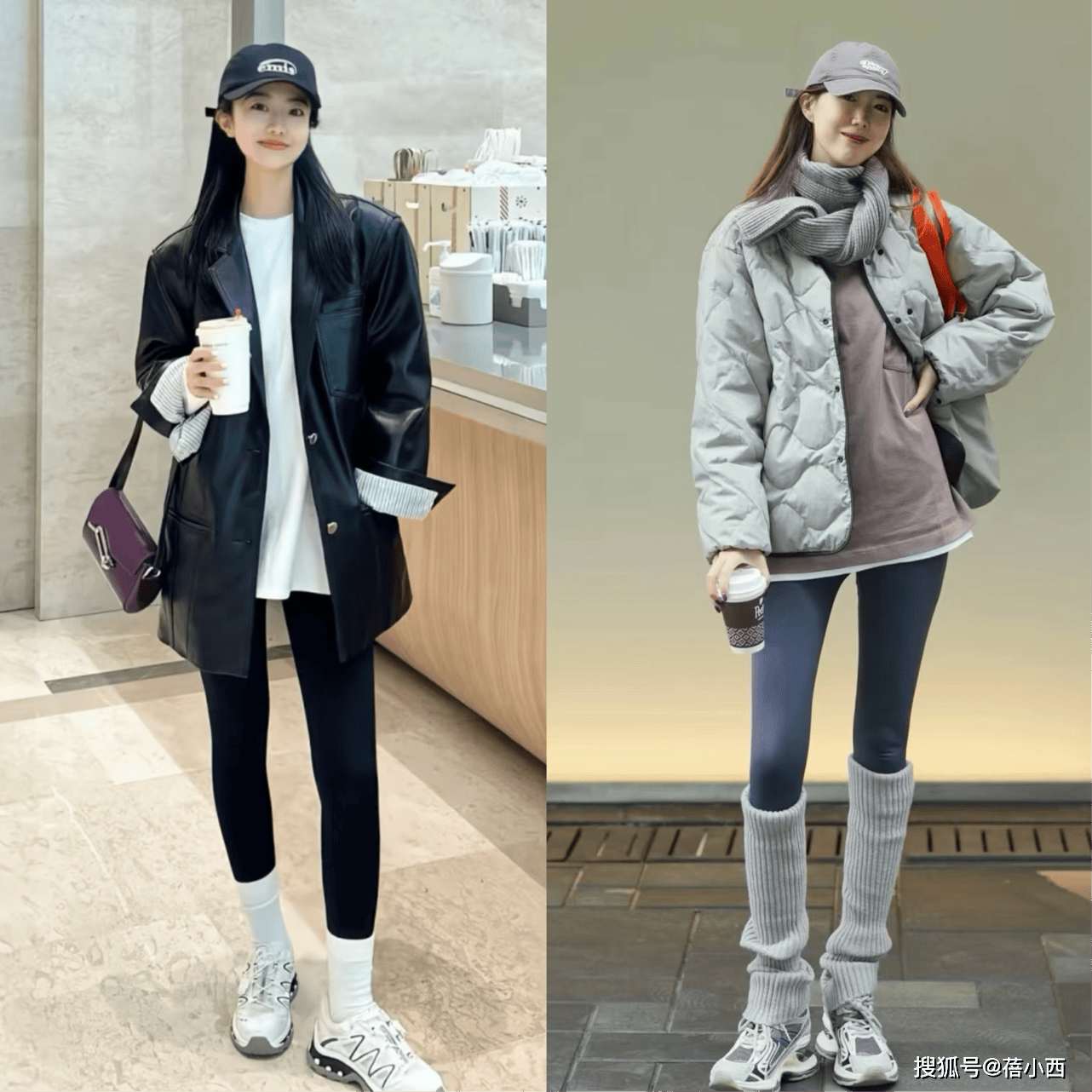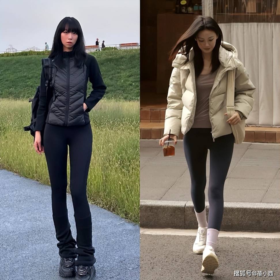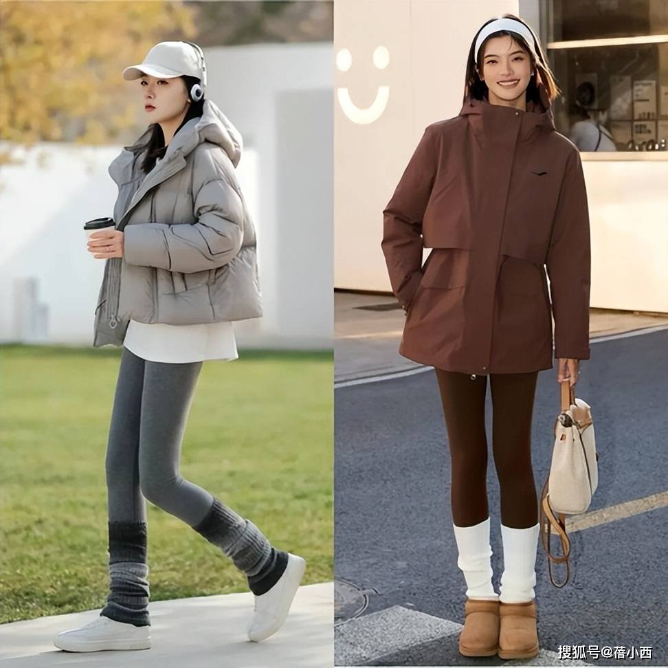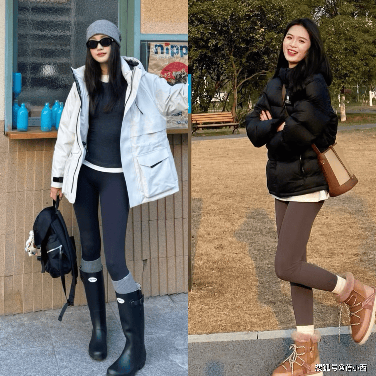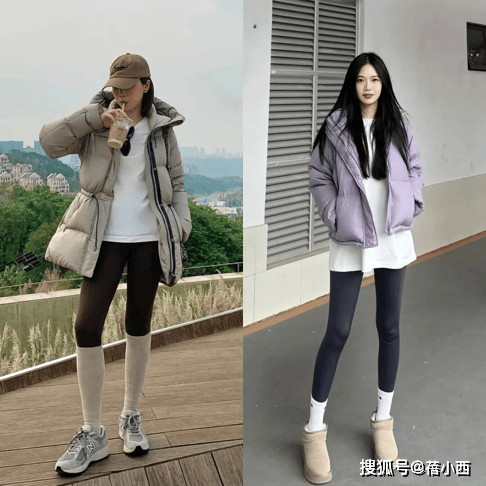 如果你很怕冷,一定得用棉服搭配鲨鱼裤,上半身穿一件厚实保暖的棉服,下半身搭配一条修身的鲨鱼裤,可以形成松紧对比,视觉上更显腿细,保暖效果也可以兼顾。