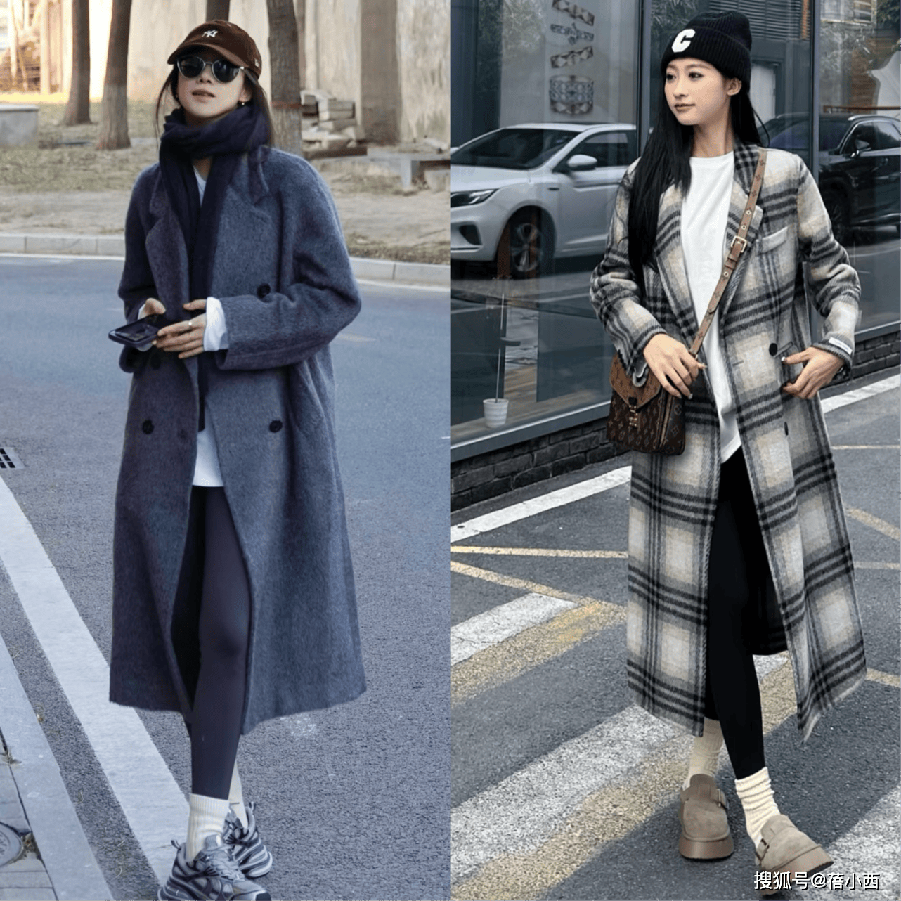 日常搭配风格比较成熟的小姐姐,你可以尝试这种中长款的毛呢大衣搭配鲨鱼裤,上半身宽松的大衣修饰了身材比例,下半身紧身的鲨鱼裤起到了收缩腿围的效果,整个搭配既保暖还利落。