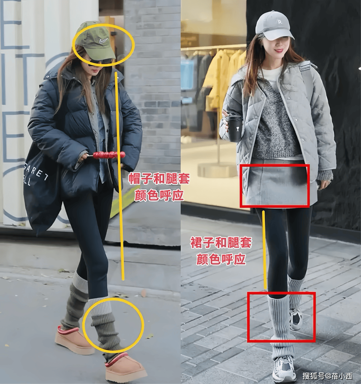当然,搭配堆堆袜的时候,一定要确保它可以和你的整个搭配呼应起来,比如帽子和堆堆袜的色彩呼应起来,裙装的颜色和袜子颜色相同,都会显得更协调,也有修饰比例的效果。