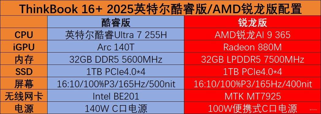相同的机型同时搭配两家处理器将造成更为直接的竞争,尤其像ThinkBook 16+这种关注度高的机型,周边配置的突出将很大程度上影响用户购买决策,比如我们这次对比的ThinkBook 16+ 2025酷睿版和锐龙版,看完了两机主要差异点后是不是会让您觉得酷睿版明显性价比更高一筹?