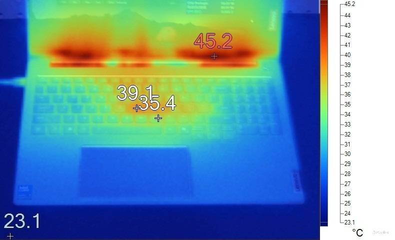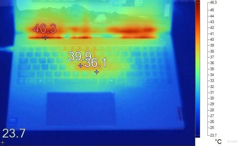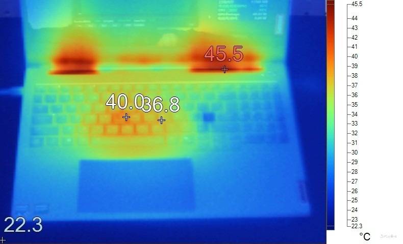从热力图上来看,锐龙版机型在性能模式时与酷睿版机型在智能模式时相近,两台机型的热点都处于转轴出风口出,键盘热点区域靠近中心。