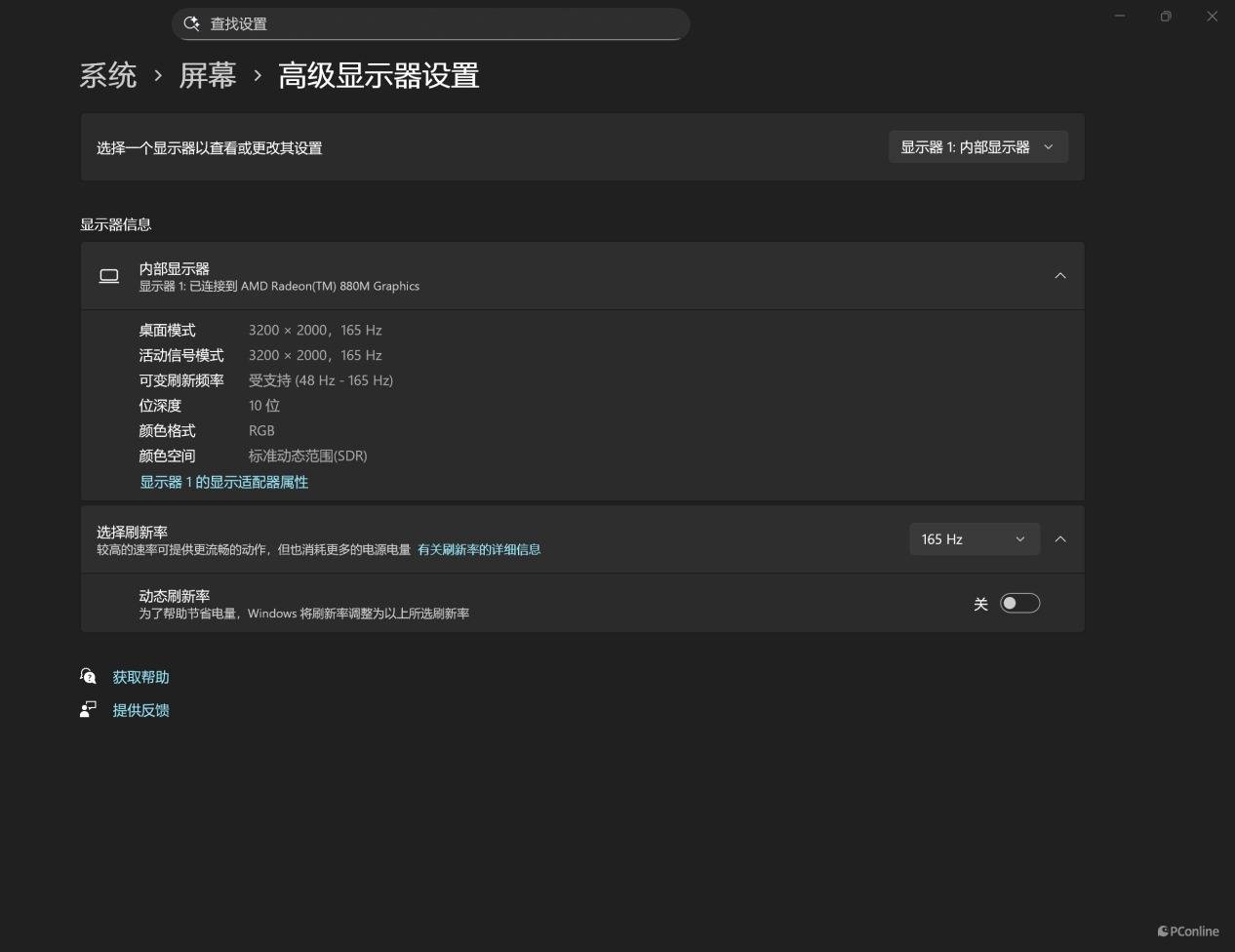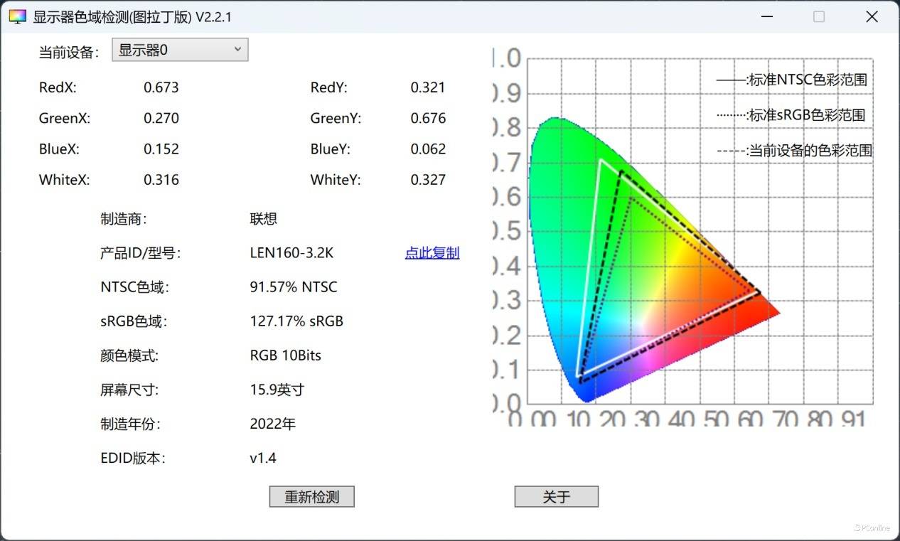 锐龙版屏幕型号识别为LEN160-3.2K,型号ID为LEN8BA1,是一块联想OEM屏幕面板,并不知道其确切型号,查阅资料发现其屏幕型号可能为华星光电MNG007ZA1-2(由于官方并没有给出具体的屏幕型号,所以该型号可能只是和这台机器上的屏幕在规格上相似),型号ID为CSO1626,与酷睿版主要差别在于最大亮度为430nit,系统中并未显示其通过了VESA DisplayHDR认证。