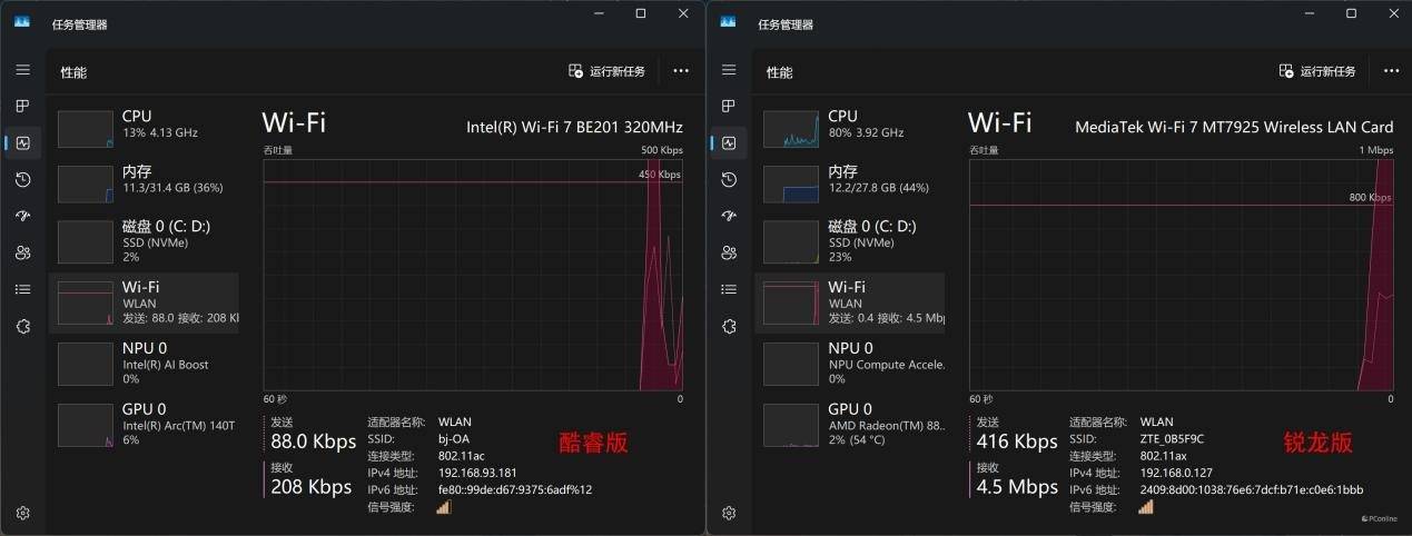 酷睿版机型搭载Intel自家Wi-Fi7无线网卡BE201;锐龙版机型搭载Wi-Fi7无线网卡MTK MT7925,隶属于MTK Filogic 360。打眼一看,两款显卡均为Wi-Fi7无线网卡,但实际参数上却有较大差距。