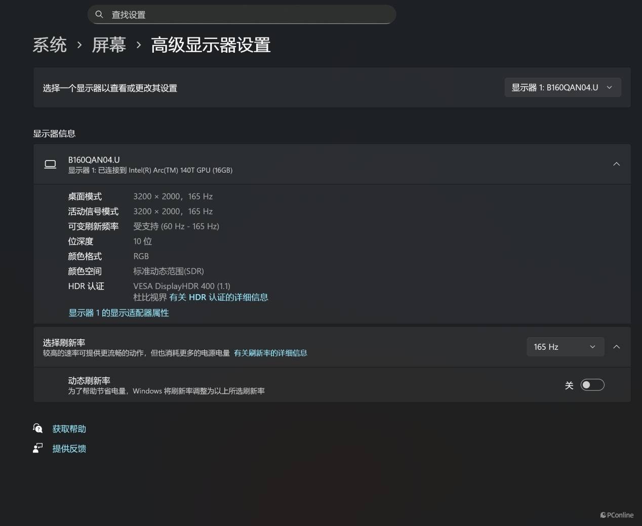 酷睿版屏幕型号识别为友达的B160QAN04.U,型号ID为AUOC4B5。是一块较新开始量产的屏幕,最大亮度可达500nit,并且在控制面板中可以看到这块屏幕还通过了VESA DispayHDR 400认证。