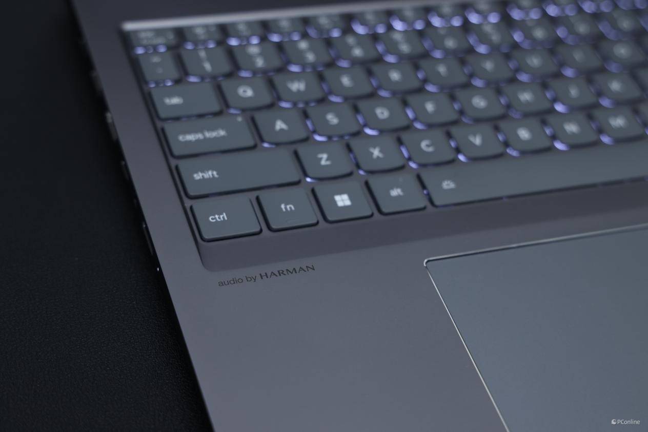 看到键盘左下角,锐龙机型则标有 Dolby Atoms的字样,支持杜比全景声技术;酷睿机型则标有audio by KARMAN的字样,扬声器经由哈曼卡顿调校,也支持杜比全景声技术,另外,酷睿版的麦克风还支持声纹识别AI降噪技术。
