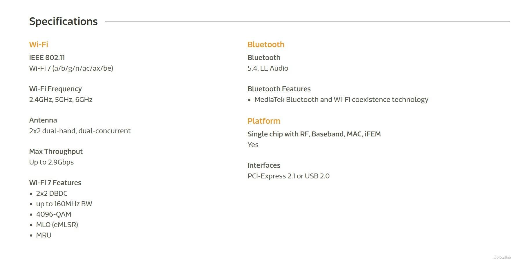 Intel BE201带宽320MHz,6GHz频段峰值速率5746Mbps,5GHz频段2882Mbps;MTK MT7925带宽160MHz,峰值速率单频2882Mbps。在对于无线网卡最为关键的带宽和峰值速率上,MTK MT7925的规格是低于Intel BE201的。此外,二者均支持蓝牙5.4,LE Audio。