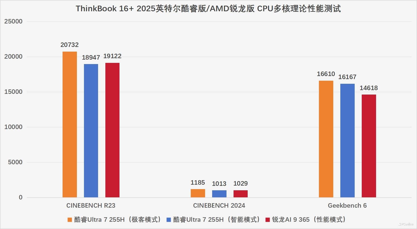 环境噪音上同样是锐龙版性能模式(45~46分贝)≈酷睿版智能模式(44~45分贝)<酷睿版极客模式(48~49分贝),结合AI 9 365极其稳定的烤机功耗、温度和核心频率,个人猜测理论上AI 9 365的性能调校还是有余量可以跑到比65W更高的功耗上的,但可惜的是联想并未给锐龙版ThinkBook 16+ 2025更高的性能释放了(当然也有可能当功耗上涨一点后AI 9 365的温度成指数上涨,不宜再调高了)。