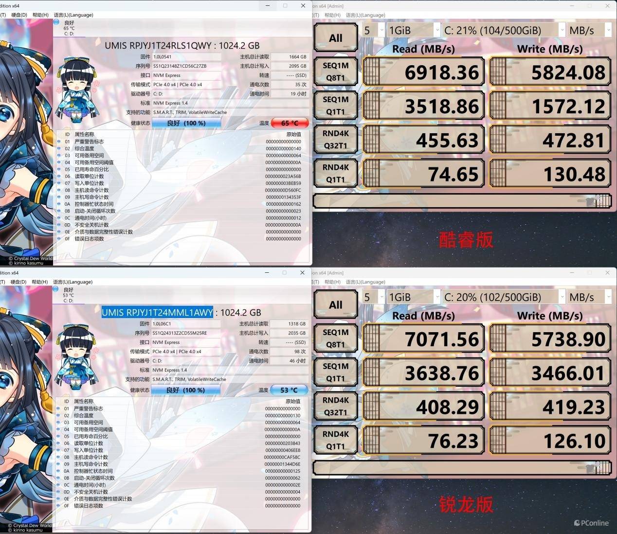 SSD上,两款机型均搭载的是来自忆联的PCIe 4.0*4 OEM盘,表现相同。