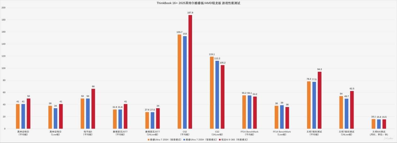 不过与锐龙AI 9 365对比,酷睿Ultra 7 255H在游戏方面是几乎全面失利,并且幅度相差的幅度可真不算小,U7 255H在跑分上还能和AI 9 365掰掰手腕互有胜负,但游戏表现上AMD锐龙AI 9 365就呈现出压倒性的态势了,3A游戏中锐龙全面领先,在测试的几款游戏中只有在FF14和侧重CPU多核性能的AI性能测试中与锐龙AI 9 365勉强打平或小幅领先;而理论上对单核性能、核间延迟与缓存更为看重的CS2中,核间延迟更高、缓存容量吃紧的AI 9 365反而平均帧率大幅度领先,RDNA 3.5图形架构看来确在这款游戏中提供了不小的帮助,1%Low帧上则是U7 255H领先一点。