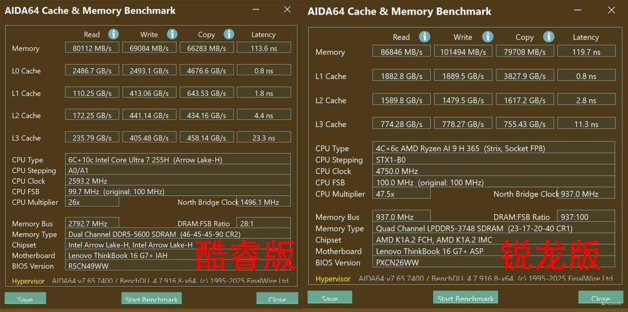 那么内存的性能差距在多少呢?我们使用AIDA 64中的Cache&Memory BenchMark测试一下。AMD锐龙版机型的32GB双通道LPDDR5 7500MHz内存在读、写、复制上面都较大幅度领先酷睿Ultra版本的32GB双通道DDR5 5600MHz内存(内存性能上面的劣势更加体现出Arc核显在DX12上跑分能力的优秀了),延迟则是酷睿Ultra版本略微领先,一方是板载内存但性能更好,一方是具备内存可升级性但性能差些,两台机型在这方面并无绝对优劣,如何取舍全看消费者自身了。