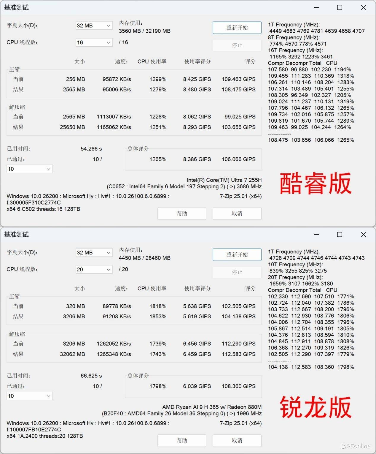 内部扩展性上,酷睿Ultra机型拥有两个DDR5笔记本内存插槽,支持DDR5 5600MHz内存频率;而AMD锐龙版本则为板载内存不支持扩展,但内存频率为32GB LPDDR5 7500MHz,内存读写相比之下会快一些,对核显性能也有正向作用。