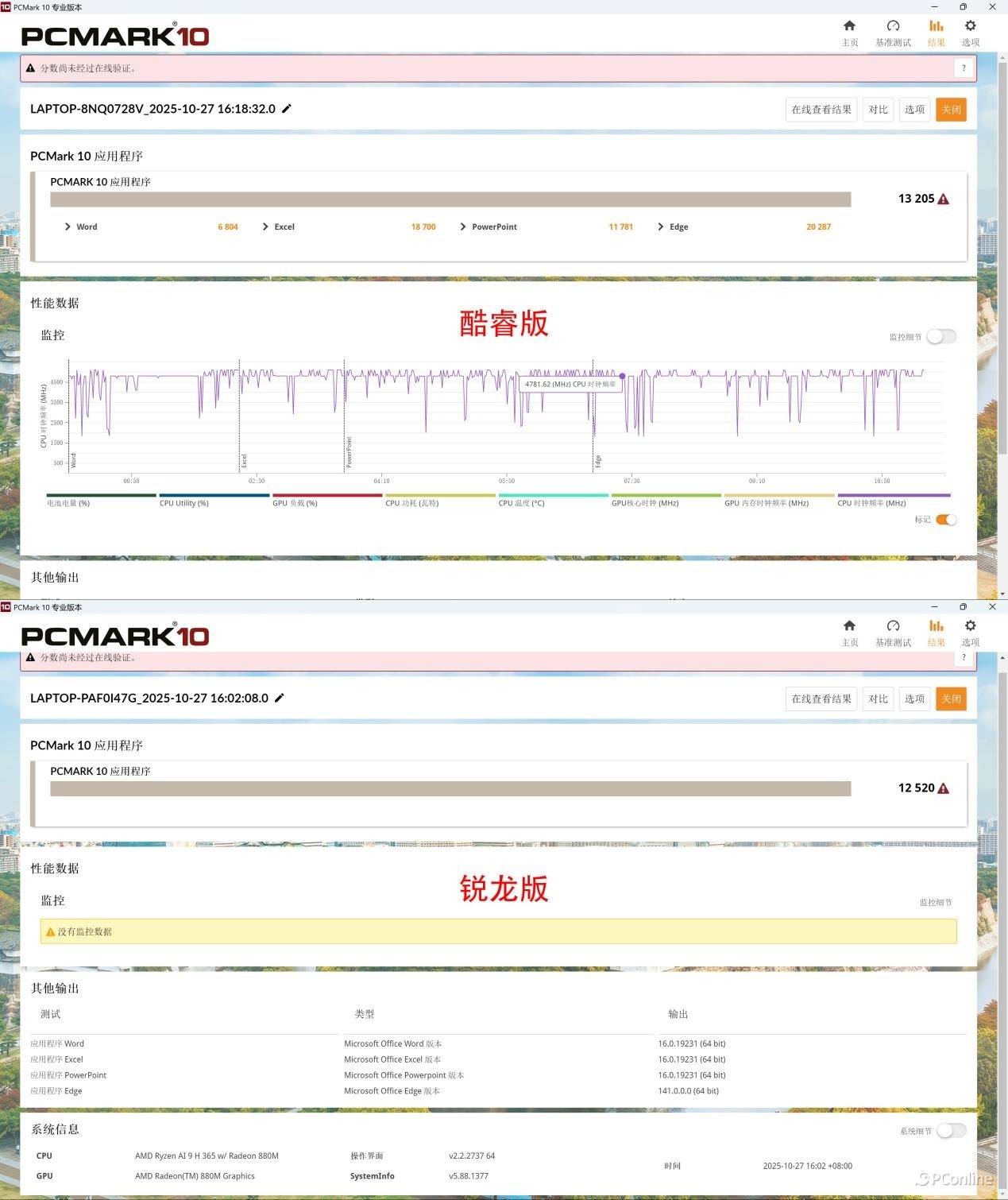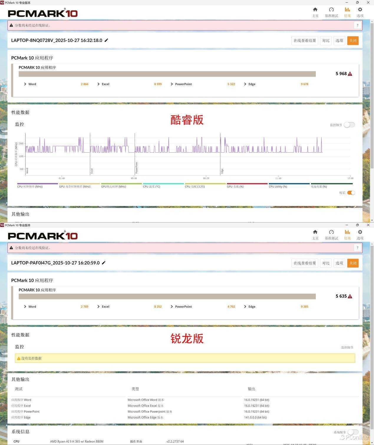 PCMark10中的应用程式项目会调用Office办公软件三大套件Word、Excel、PPT以及Edge网页进行一系列的脚本操作,可以反映出两个系统在这些软件方面的性能表现,成绩如下: