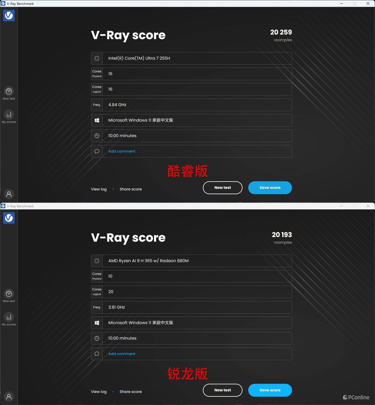 使用V-ray BenchMark以及Blender BenchMark对两个系统的渲染能力进行测试,其中V-Ray BenchMark设置测试时间为10分钟,成绩如下: