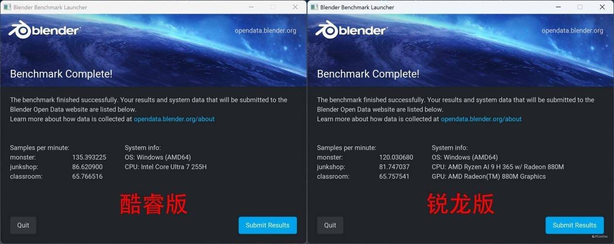 V-Ray BenchMark均不支持调用两家核显,所以测试成绩为CPU纯物理运算,结果是两者不分伯仲,基本处于同一水平线;Blender BenchMark中纯CPU物理运算酷睿Ultra 7 255H处于小优。不过在硬件支持上面Blender BenchMark适配调用AMD锐龙的Radeon核显、不支持酷睿Ultra中的Arc核显,虽然仅使用AMD锐龙Radeon核显时效率也没多高,但是在实际使用时CPU与GPU协同工作,就会有更好的效果了。