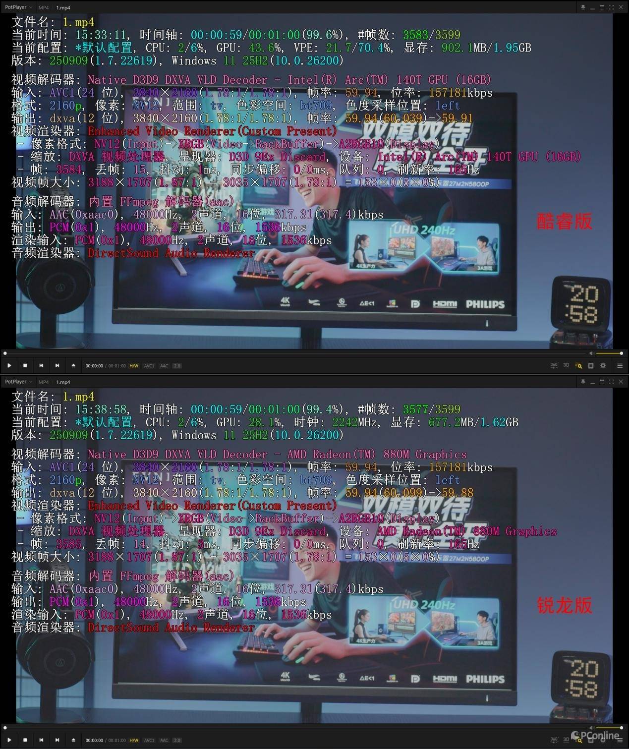 在一分钟的视频播放阶段,两台机型基本都是压着视频原帧率播放的,丢失帧率为酷睿版本丢失15帧,锐龙版本丢失14帧率,水平一致,本地硬解4K60fps高码率视频两台机子都不成问题。另外还值得关注到的一点是GPU的占用率,酷睿版本在播放阶段GPU占用在45%左右,锐龙版本GPU占用不超30%。