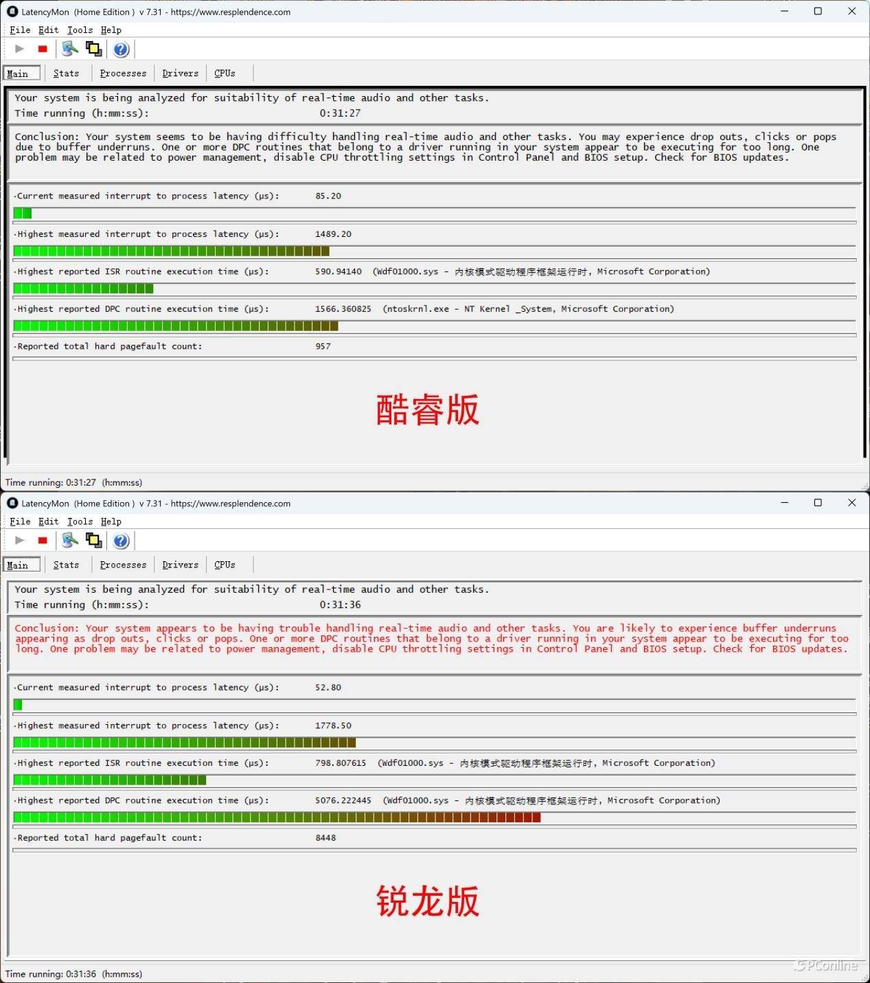 30分钟的测试中,锐龙版机型报红,表明其检测到了较为严重的DPC延迟,数值为5076μs;而酷睿版检测到的DPC延迟为1566μs,该数值未达到报红阶段,表明并不会影响整机的使用。