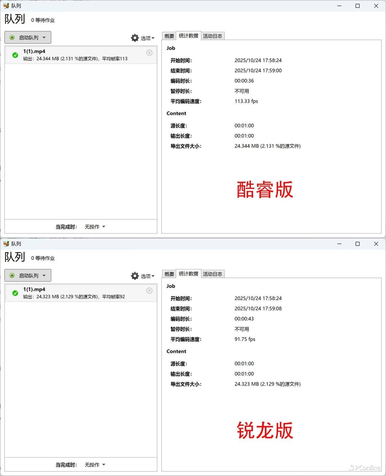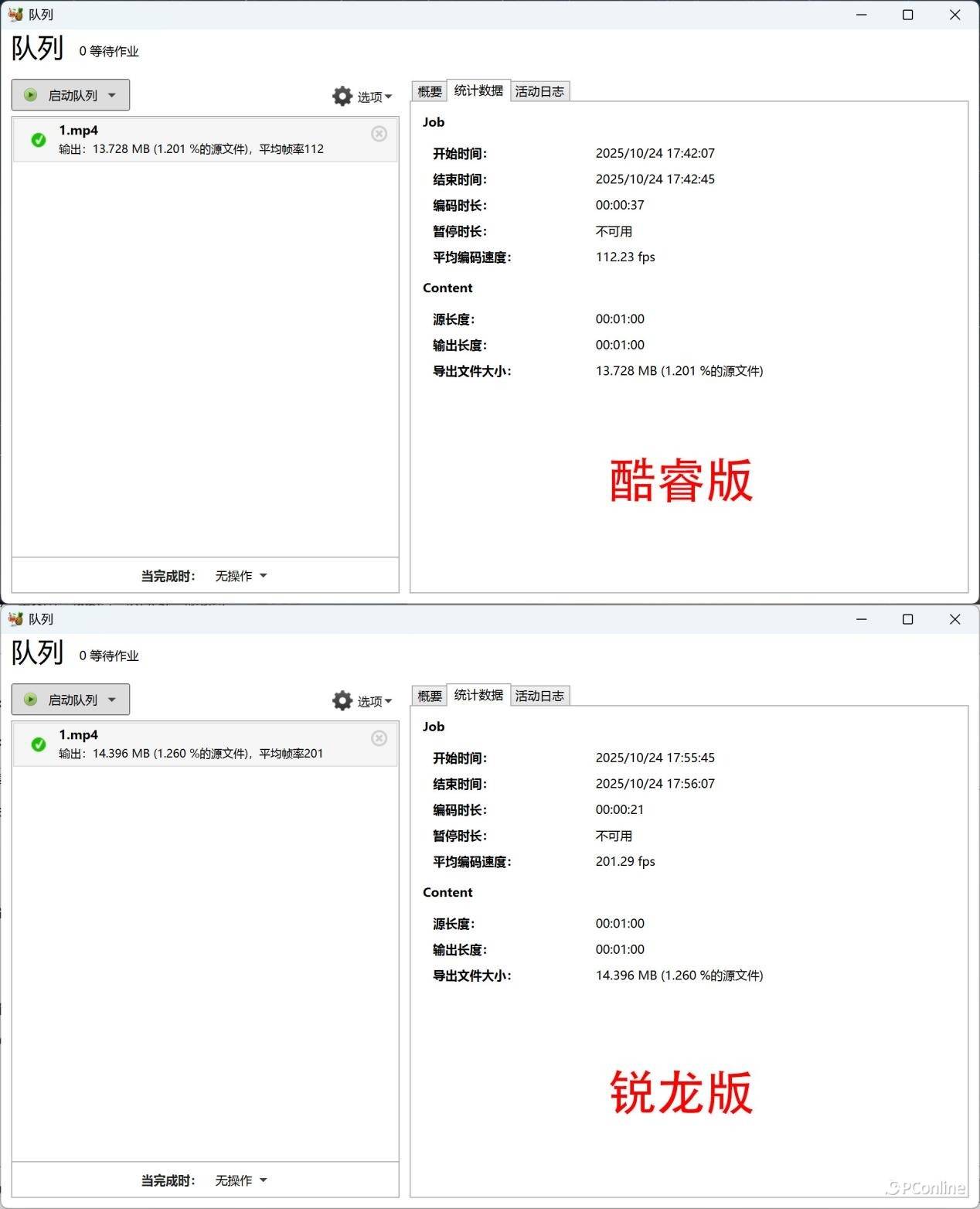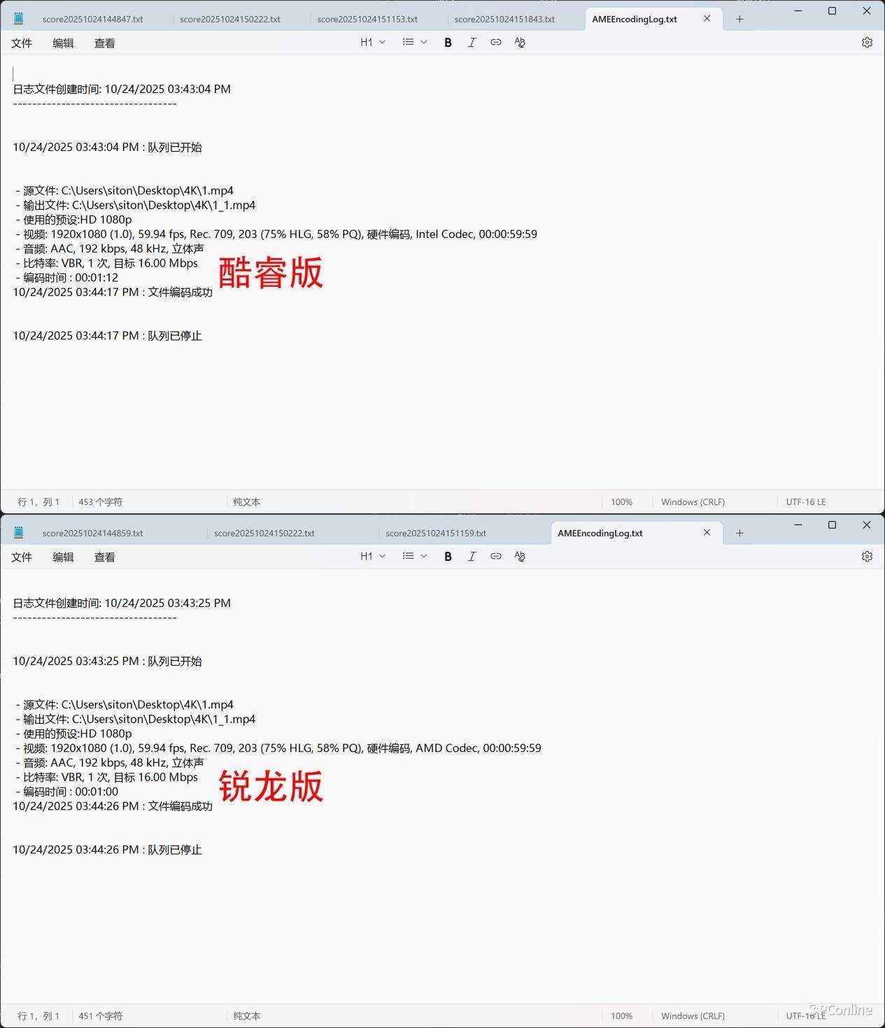 我们再换用另一款来自Adobe的转码软件Media Encoder进行测试,还是相同的视频,转码设置为预设的HEVC 1080P格式,所需时间如下所示,酷睿Ultra 7 255H用时1分12秒,锐龙AI 9 365用时1分钟,依旧是AMD锐龙AI 9 365版本更胜一筹。
