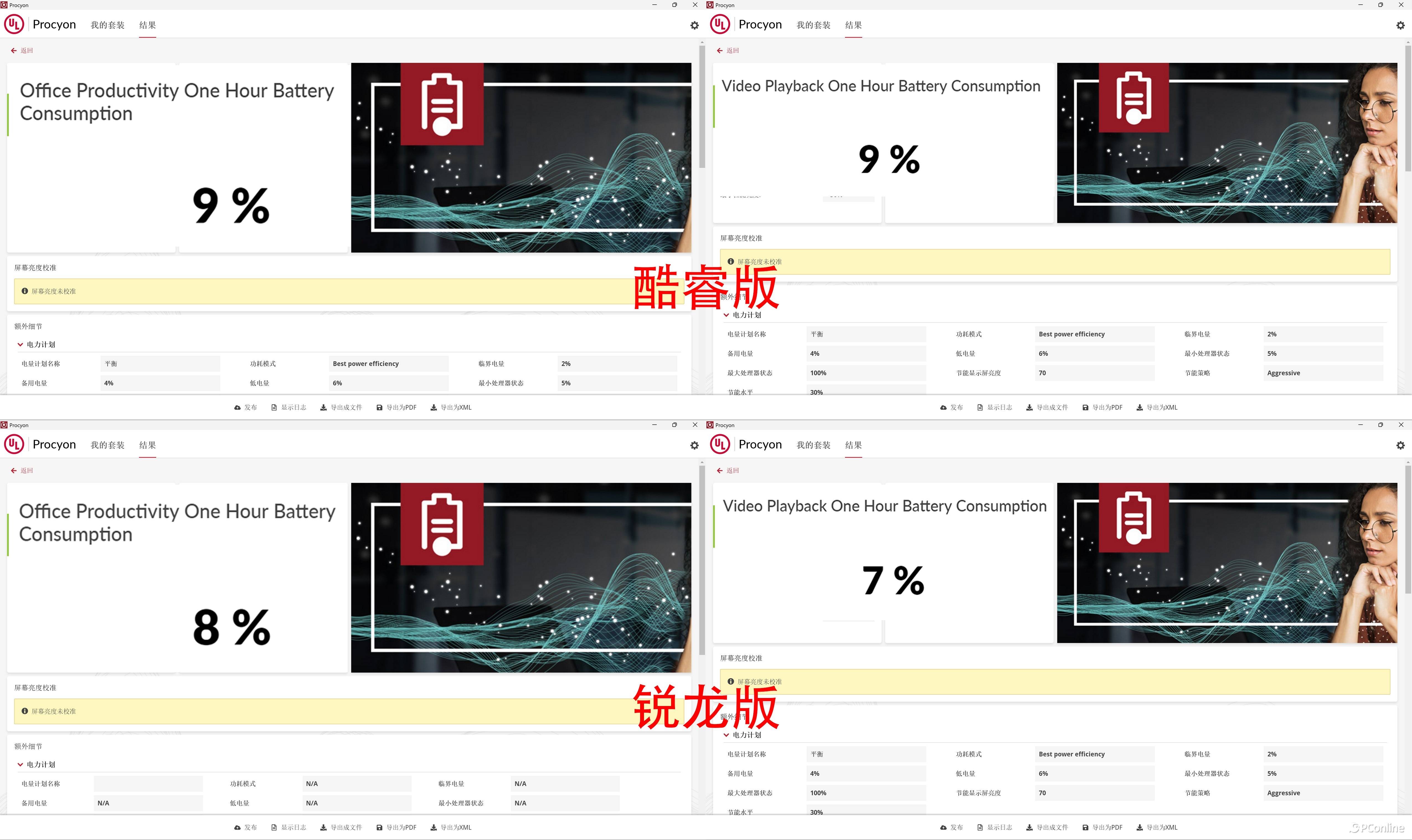 两个项目中Ultra 7 255H版本的耗电量都略高于锐龙AI 9 365,在UL Procyon 的基准续航能力测试中,锐龙AI 9 365是更加省电的。