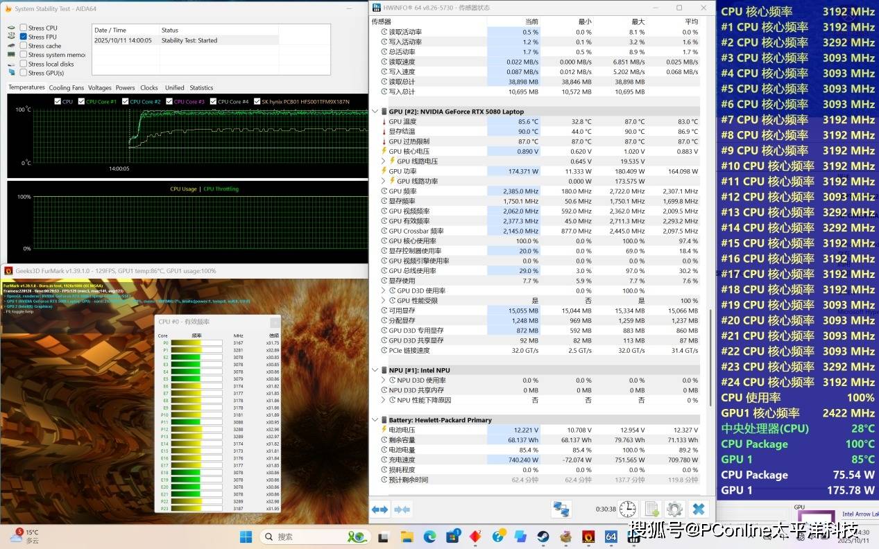 在实际散热效果方面,暗影精灵MAX在狂暴模式+智能拉满下,可提供CPU 75W+GPU 175W共250W的性能释放,与当下游戏本市场中同等产品的性能释放水平相同,其中RTX 5080 Laptop GPU可达到满血功耗的运行,完全释放出其性能。