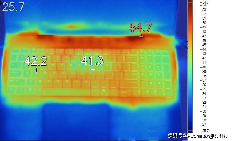 最后,我们还进行了C面表面温度的测试,在2.5K超高画质下进行30分钟游戏后进行测试,环境温度大致为25度左右,C面的热点位置位于右侧转轴出风口处,温度为54.7度;主要的WASD操作区域方面,W和S键中间位置为42.2度。