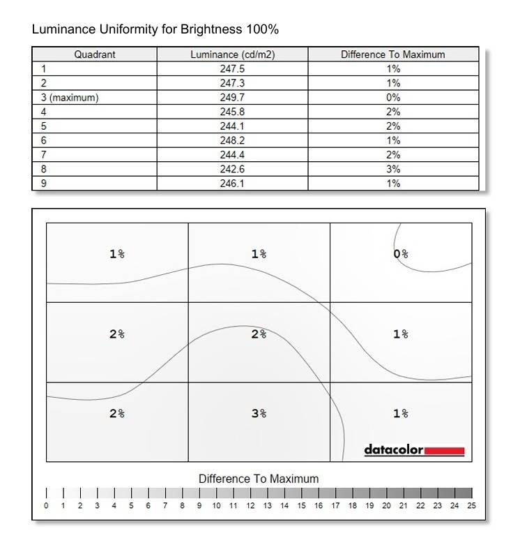 至于亮度均匀性方面,OLED的自发光特性再次展现出了极高的优势。在100%的最大亮度下 ,屏幕的最大亮度区域位于3号区域(右上角) 。最大的亮度偏差区域出现在屏幕底部中央的8号区域 ,但差值仅为3% 。这是一个非常优秀的成绩,肉眼几乎无法察觉亮度差异。