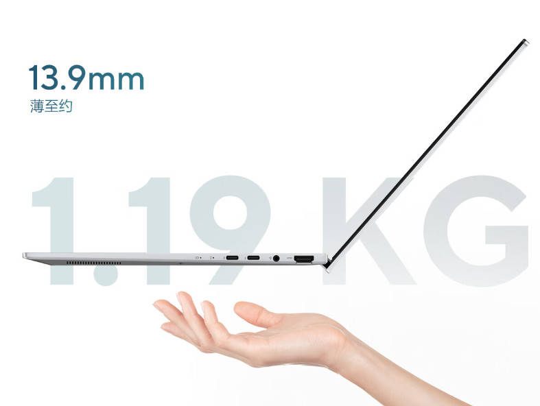 它的机身薄至13.9mm,重量轻约1.19kg,真正做到了“羽量级”设计,让你在通勤、差旅途中轻若无物,轻松放入背包,随时随地开启高效办公模式。