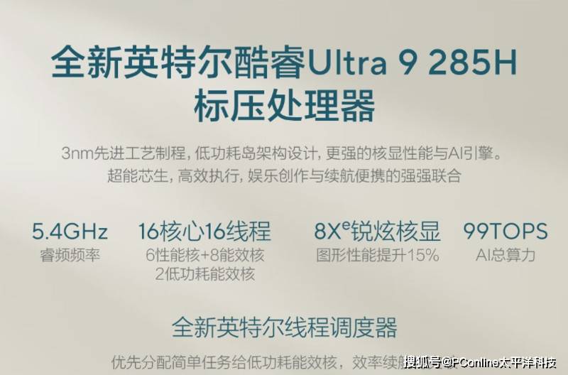 对于一台定位高端的轻薄本而言,性能是立足之本。处理器方面,它搭载了全新的第二代英特尔酷睿Ultra 9 285H标压处理器。这颗芯片采用了先进的制程工艺,拥有高达16核心16线程的豪华规格,最高睿频可达5.4GHz。