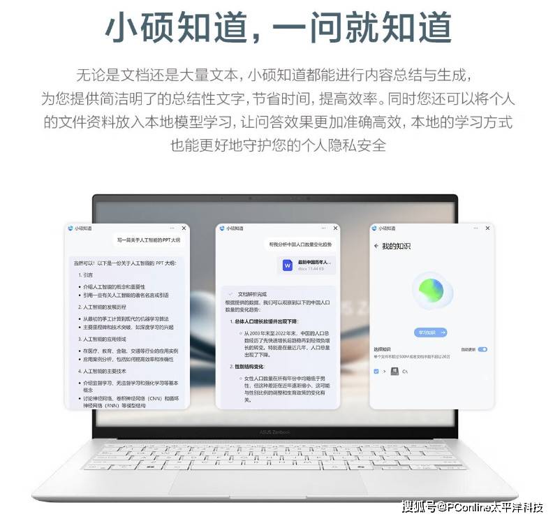 除了硬件上的强劲表现,华硕灵耀14 2025内置了全新的“小硕知道”AI智能助手,为用户的工作与创作效率再加buff。当你写方案时,遇到资料整理难题,小硕知道能快速扫描本地文档,一键总结核心内容,省去逐字逐句梳理的时间。
