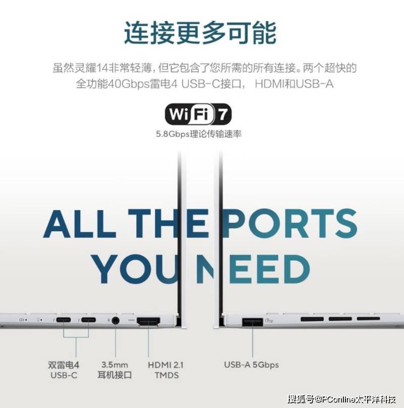 另外,华硕灵耀14 2025还配置了齐全的接口,包括两个雷电4 USB-C接口、一个USB-A接口、一个HDMI 2.1 TMDS接口以及一个3.5mm耳机接口。日常使用时,无论是连接高速固态硬盘、4K显示器,还是键鼠、U盘,都不再需要反复插拔转接器,外接设备前所未有的方便。