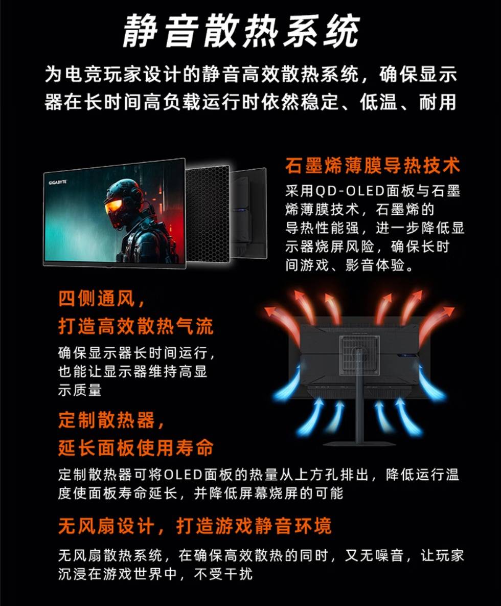 而对于OLED的“灵魂拷问”——使用寿命与烙印(烧屏)风险,AORUS FO27Q5P展现了技嘉作为大厂的自信与担当。它采用了一套精心设计的被动散热系统。内部不仅有定制的散热器,更巧妙地运用了石墨烯薄膜进行高效导热,配合四侧通风设计,确保面板热量能迅速排出。这套高效且完全静音的无风扇散热方案,极大地降低了OLED面板因长时间高温运行而产生烙印的风险。