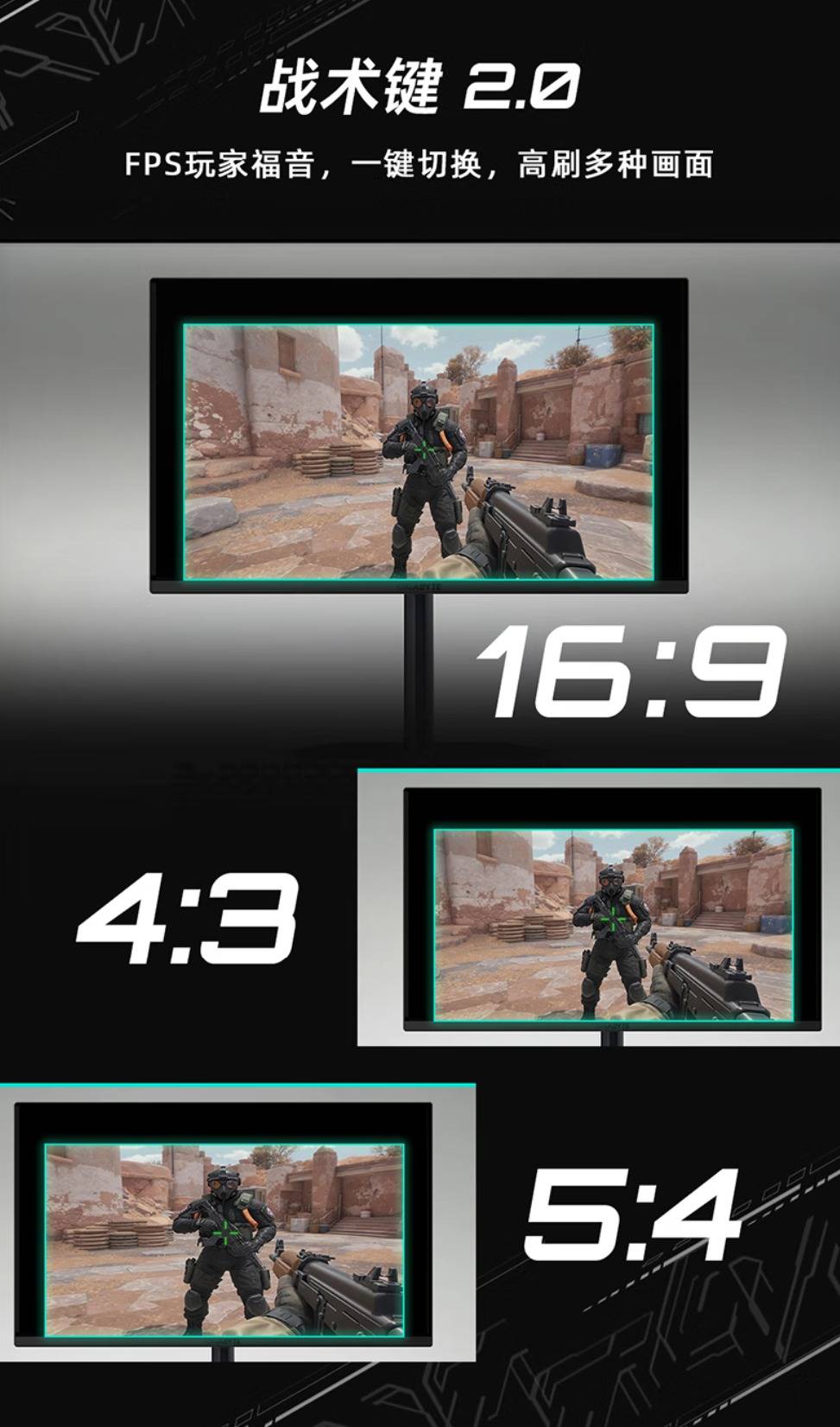 最值得一提的便是其创新的“战术键2.0”功能。这块屏幕拥有2560 x 1440的黄金2K分辨率,在27英寸上提供了绝佳的清晰度。但技嘉也理解,许多职业选手和硬核FPS玩家,出于长年累月的肌肉记忆和对视野的极致专注,更习惯于24英寸甚至1080P的分辨率。FO27Q5P允许玩家通过一个物理按键,一键将显示模式切换到24英寸1080P,甚至支持多种经典的4:3或5:4比例。你无需在清晰度与竞技习惯之间做出痛苦抉择,一台显示器,便能满足3A沉浸与硬核竞技的全部需求。