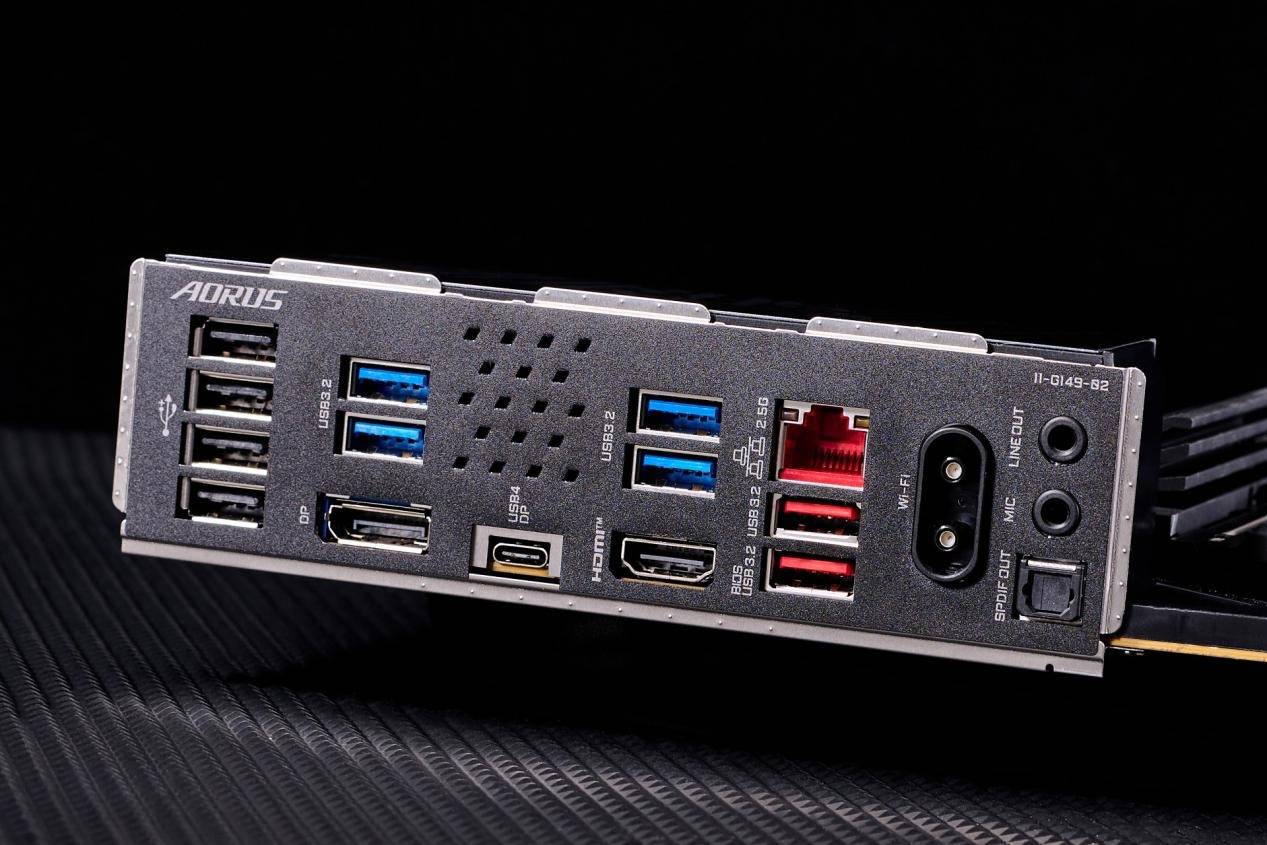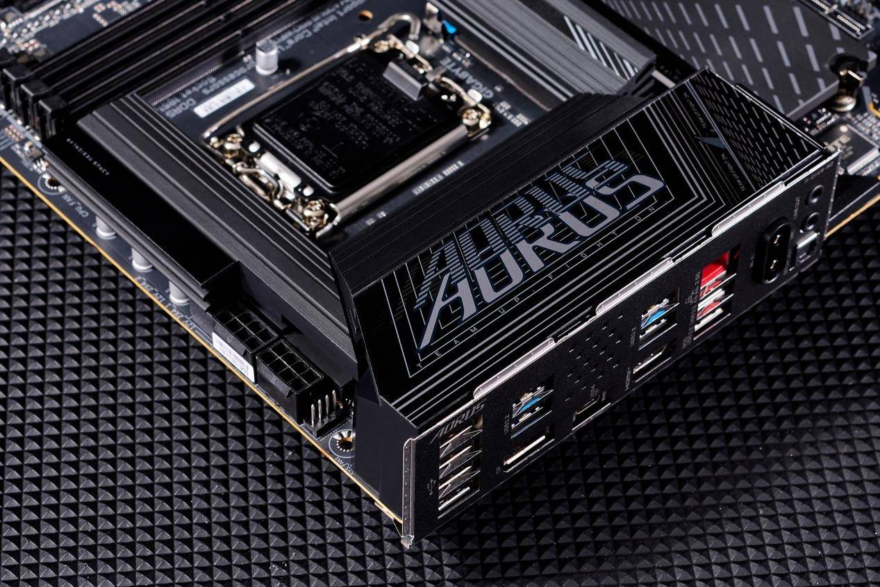 尤其是左侧的装甲部分更是延展到了后置IO区域,形成一体化的散热结构。同时装甲表面还覆盖了装饰卷板,上面印上AORUS艺术字设计,配合上独特的ARGB灯效,极具潮流感。