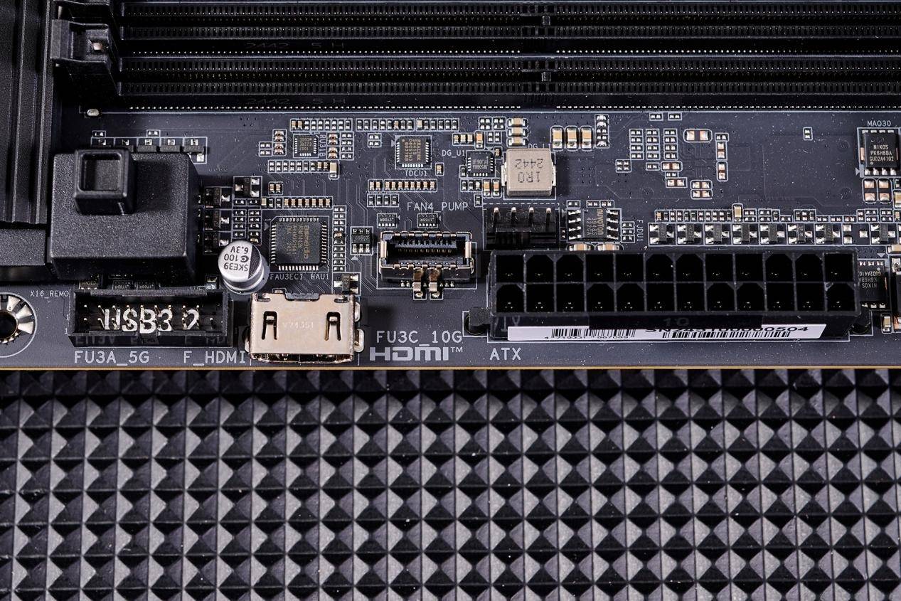 侧面是主板24Pin ATX供电接口、4Pin PWM风扇接口、前置USB-C接线、前置HDMI接口以及USB-A 3.0接口。