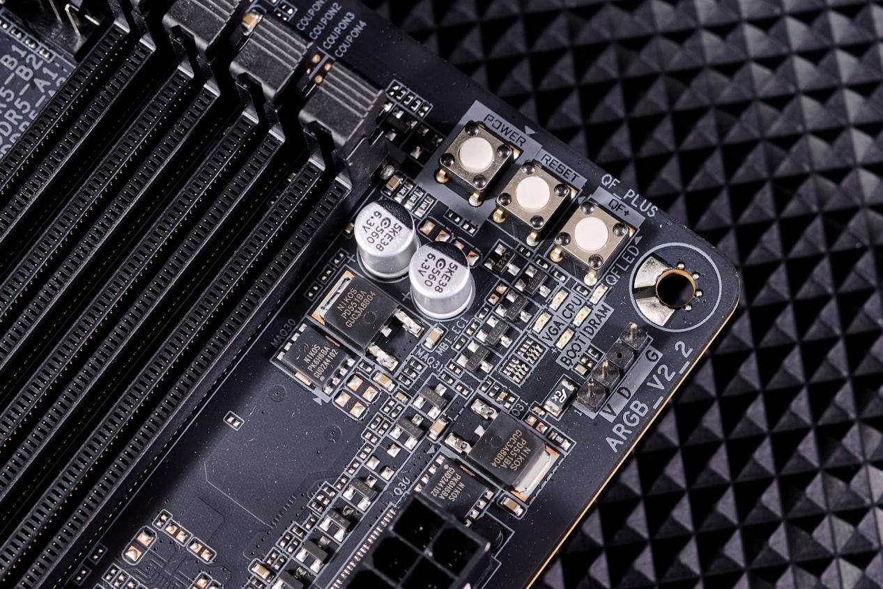主板还提供了一组超频调试按钮和Debug灯组,可以让用户快速了解主板当前状态,精准排查启动异常。尤其是喜爱超频的玩家,可通过重启按钮与清除CMOS按键快速调试,大幅提升装机与调校效率。