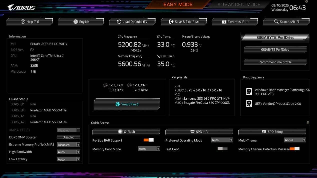 进入技嘉B860M电竞雕主板BIOS,并利用U盘刷新到最新版本的F7,以确保主板对新硬件的兼容性与性能调校达到最佳状态。BIOS界面延续技嘉一贯的简洁逻辑设计,易用性与功能性兼具。