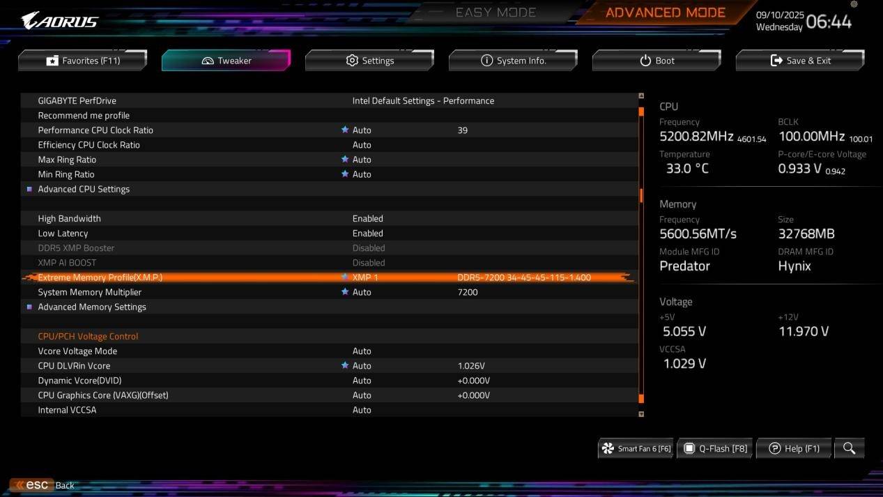 当然使用上支持高频内存,那么XMP档案是必须开启的。开启XMP后,宏碁掠夺者Hera影锋RGB超频电竞内存频率提升到了DDR-7200,小参也达到了CL34-45-45-115。同时我们还需要把技嘉独立的高带宽低延迟内存技术:HighBandwidth与Low Latency两个选项均手动开启,以进一步释放内存性能潜力。