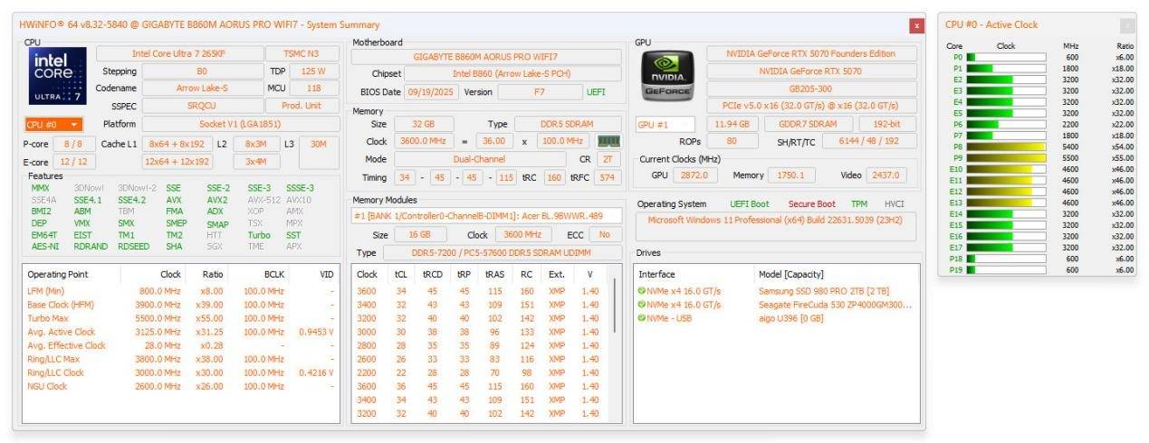 测试平台方向,我们选用了来自Intel 酷睿ULtra 7 265KF处理器,搭配宏碁掠夺者Hera影锋RGB超频电竞内存,NVIDIA GeForce RTX 5070显卡,构建了完整的高端游戏与创作平台。