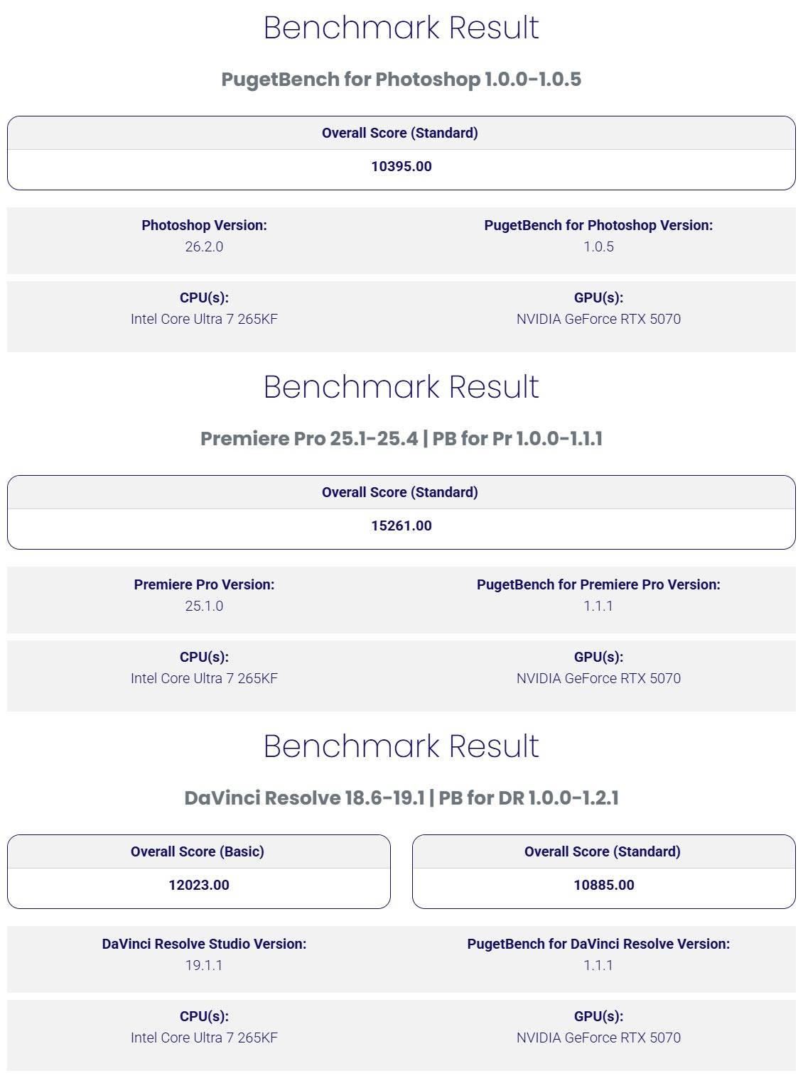 一整套创作者测试软件包括Pugetbench for PS、PR及达芬奇中,均展现出卓越的生产力表现。UL Procyon软件中的图像处理与视频编辑测试也取得了优异成绩。
