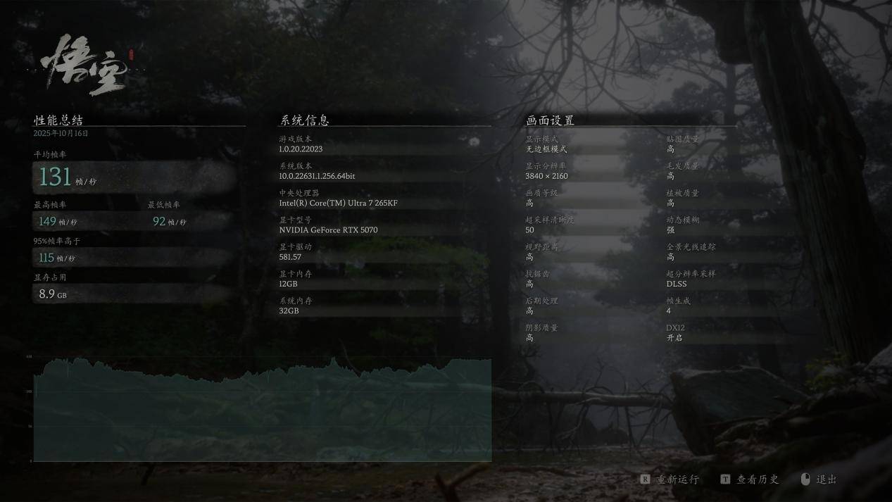 最后是游戏性能测试,Intel 酷睿ULtra 7 265KF处理器与技嘉B860M电竞雕的搭配能够充分发挥NVIDIA GeForce RTX 5070的图形处理实力,在游戏性能方面有着出色的表现。