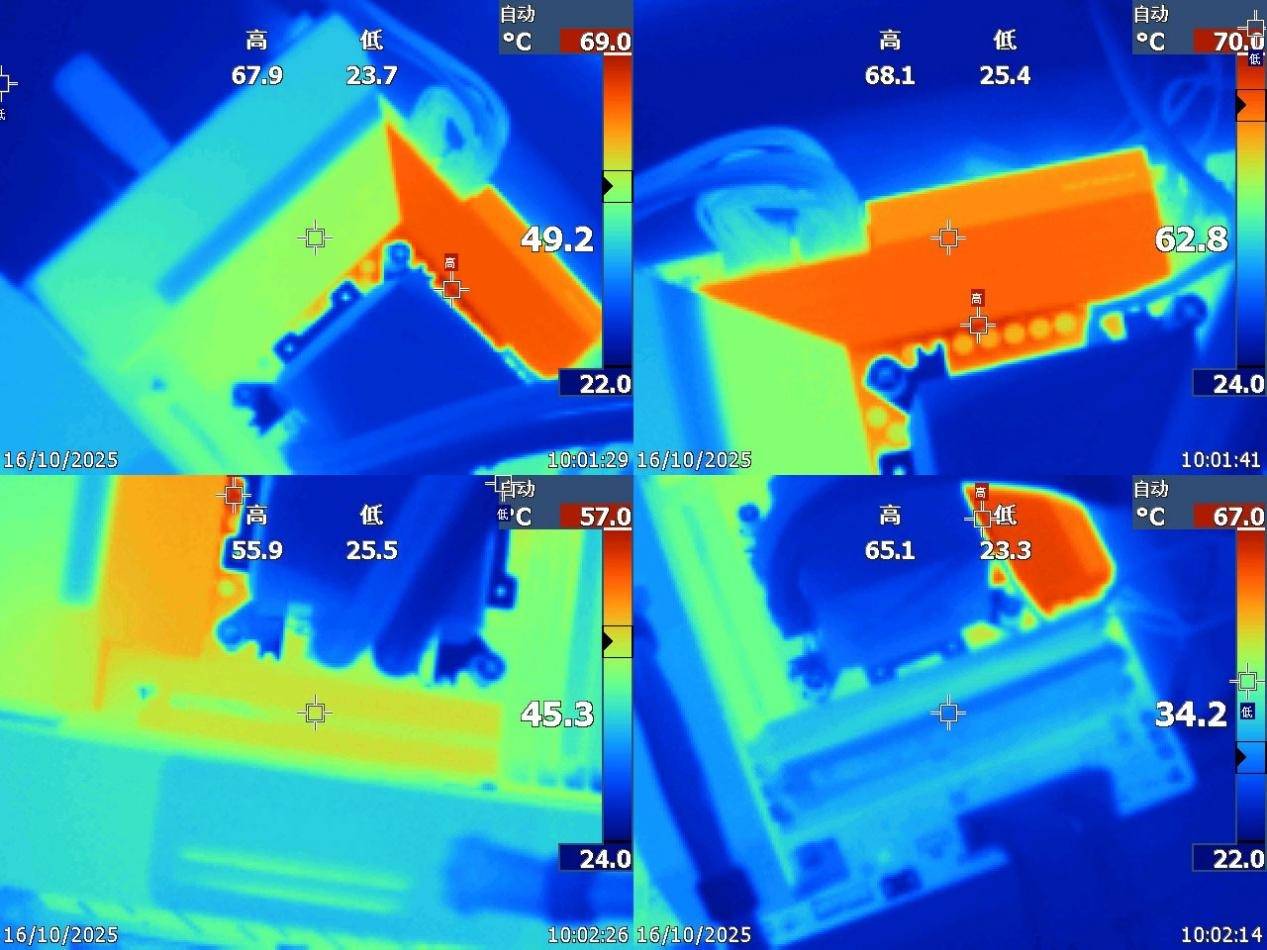 同步拿热成像仪对主板进行扫描,发现供电区域温度分布均匀,主要热源集中在主板的上方VRM供电模块上,无明显热点堆积现象,侧面印证了其高效散热设计与优质用料的协同表现。